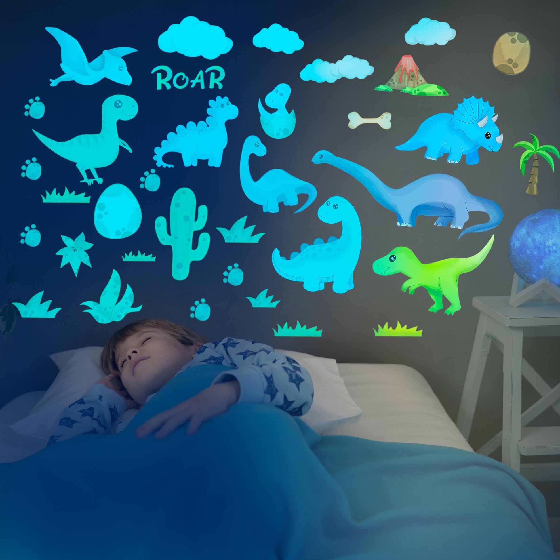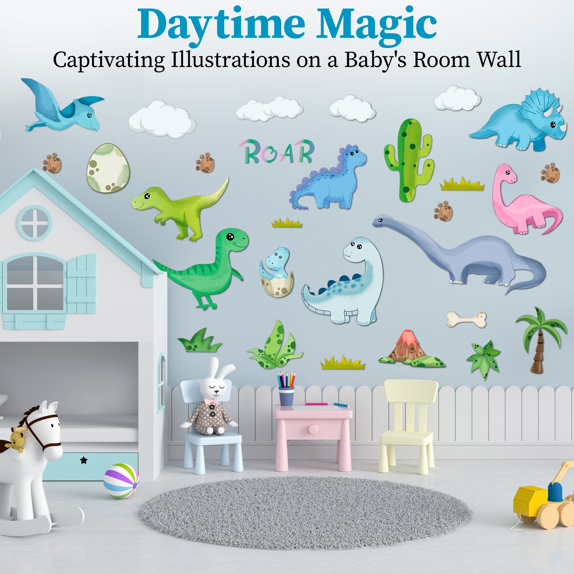 A set of big and real-looking Dinosaurs made from high-quality and luminous material. These stickers look vibrant during the daytime and give off a bluish magical glow at night.