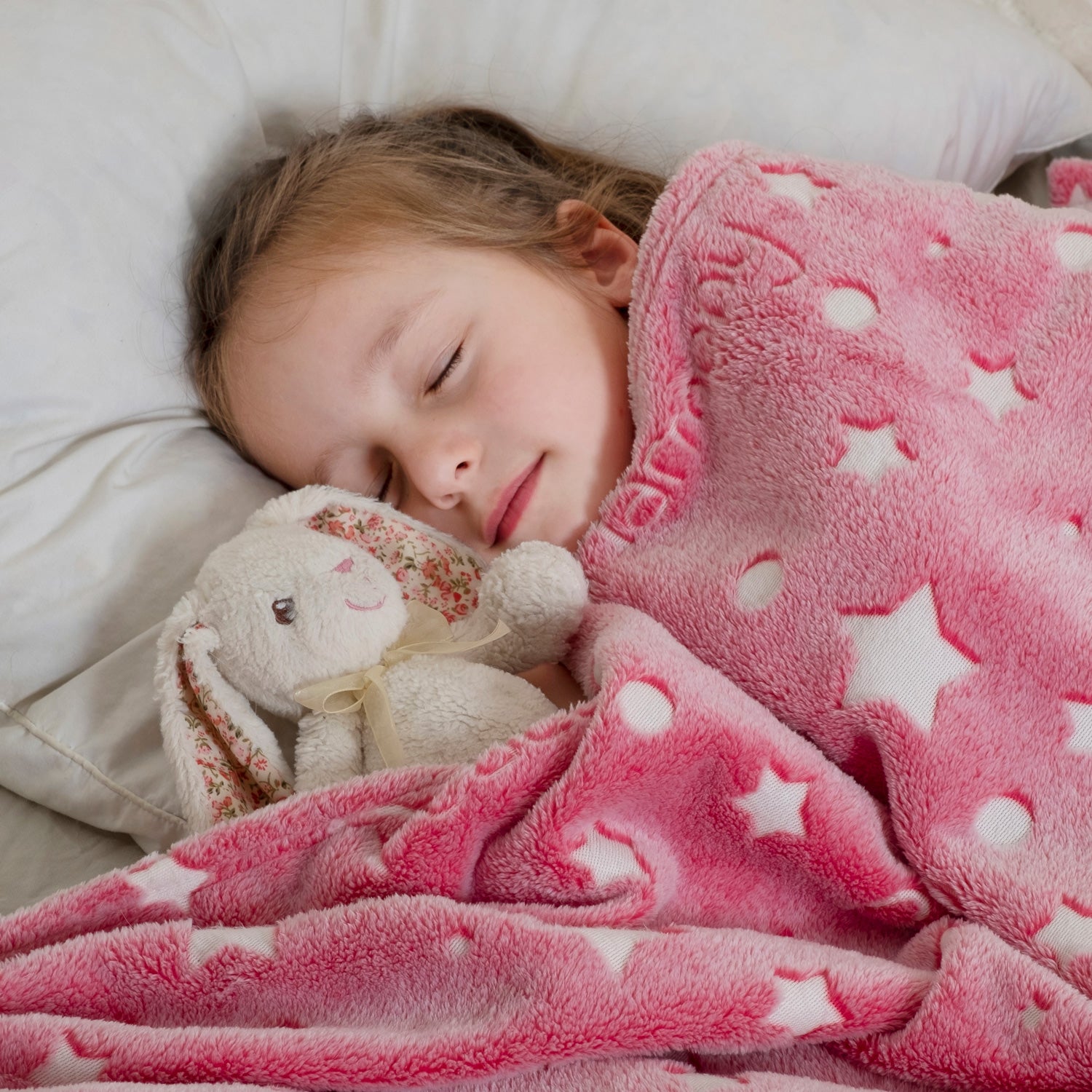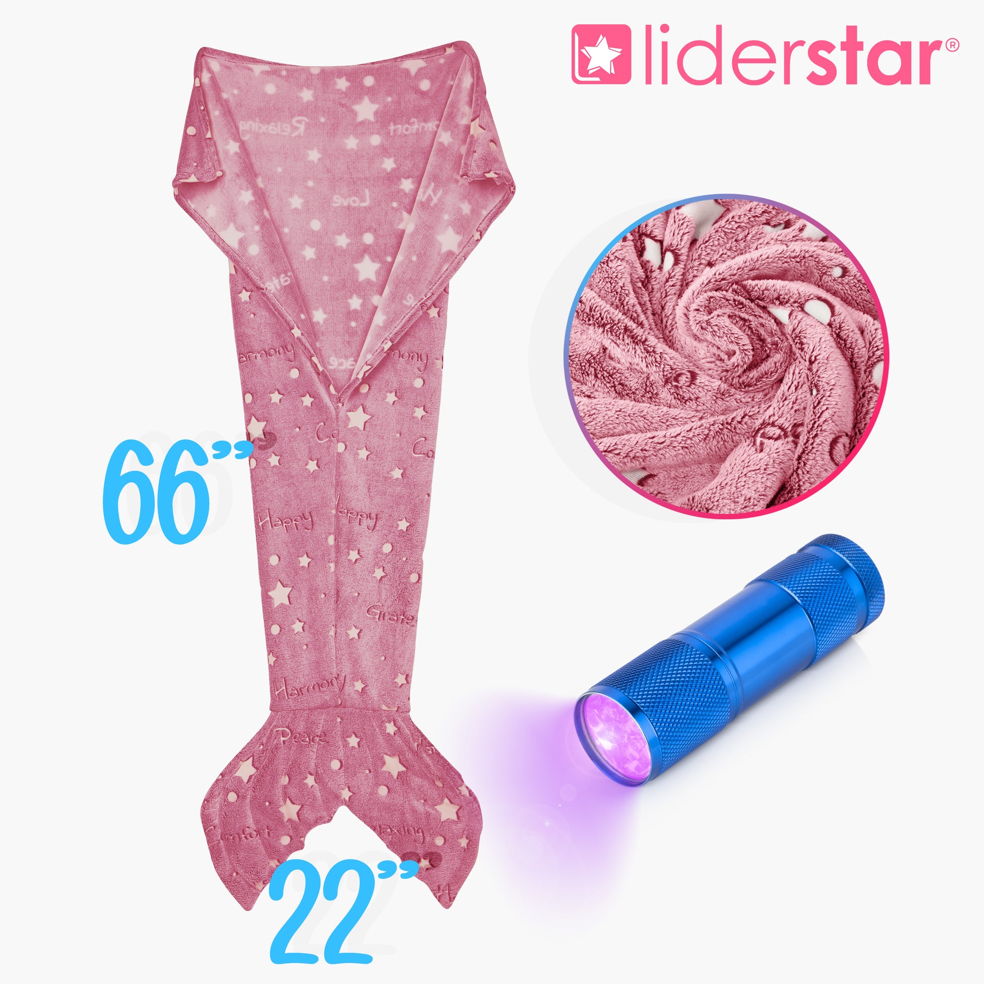 The Glow in the Dark Mermaid Tail blanket is adorned with stars and words of encouragement like Grateful, Harmony, Happy, Peace, Comfort, Relaxing, Hope and Love. Just Expose the blanket to UV flashlight light or daylight, turn off the lights, and watch the magic happen.